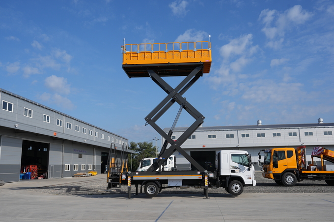 장비는 3.5톤급 샤시 위에 구성되어 도심지·산업단지·산지 등 좁고 복잡한 도로에서도 손쉽게 진입할 수 있다. 또한 차량 PTO 기반의 고효율 유압 구동 시스템이 적용되어, 상승·하강 시 부드러운 움직임과 안정성이 확보되어 반복 작업에서도